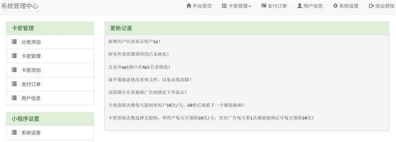 界面布局智能适配,顶部横幅图支持智能联动机制,开启视频广告模式后自动隐藏,页面视觉更简洁整洁。系统搭载完善的权限与领取限制机制,精准管控用户使用频次:常规模式下,单个用户每日限制领取卡密 10 次;同时配置观看冷却规则,观看激励视频后需间隔 60 秒,才可解锁下一次视频观看权限。